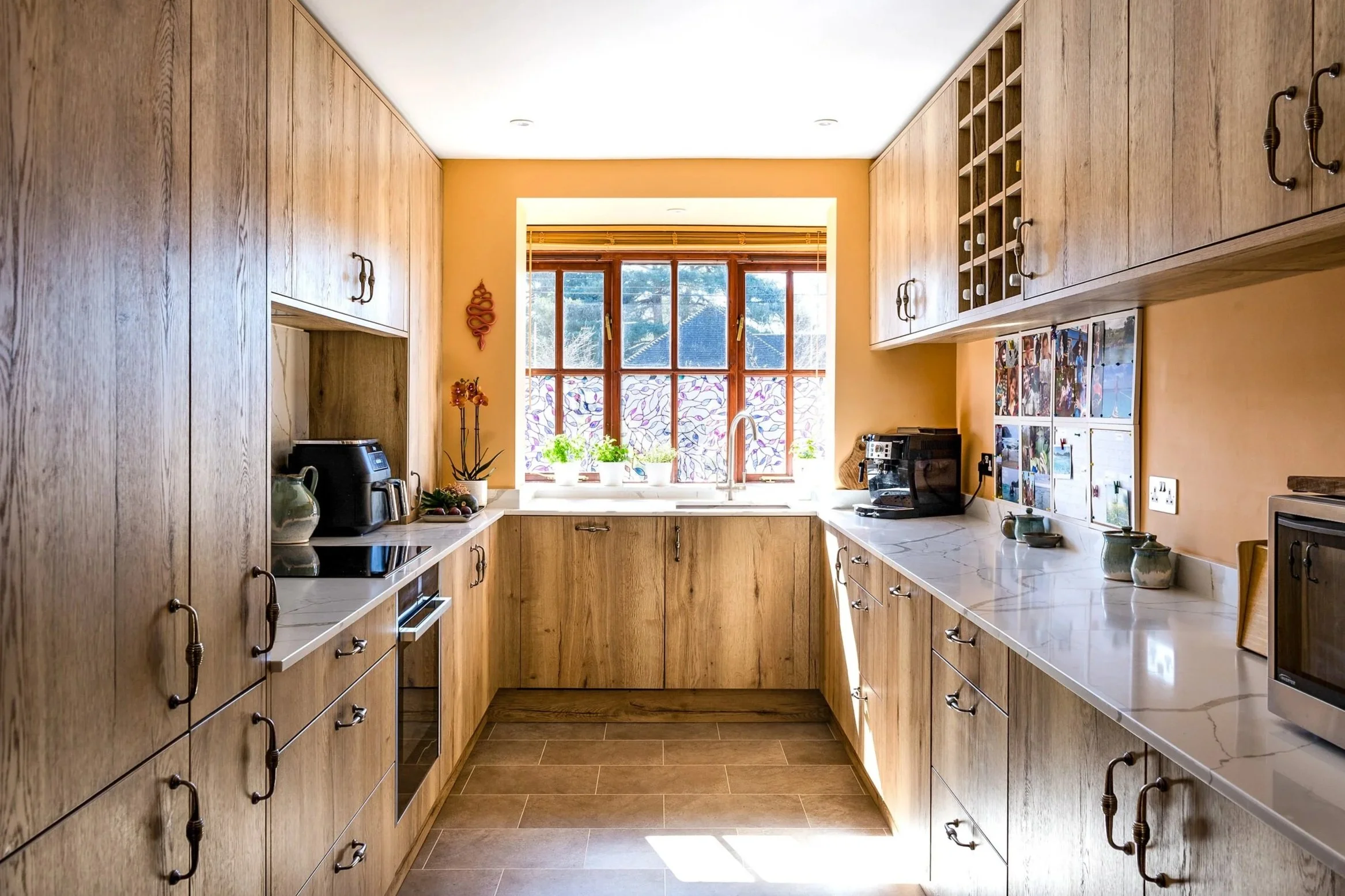 The ground floor is arranged generously around an open plan sitting and dining room, where warm oak floors and French doors to the garden give the space an easy, unhurried feel. The kitchen is bespoke throughout, with Egger resin laminate cabinetry, marble worktops and a wide garden-facing window that fills the room with morning light. Two further rooms on this level offer flexibility, currently configured as bedrooms, though one works equally well as a study or home office. A stylish shower room completes the ground floor.