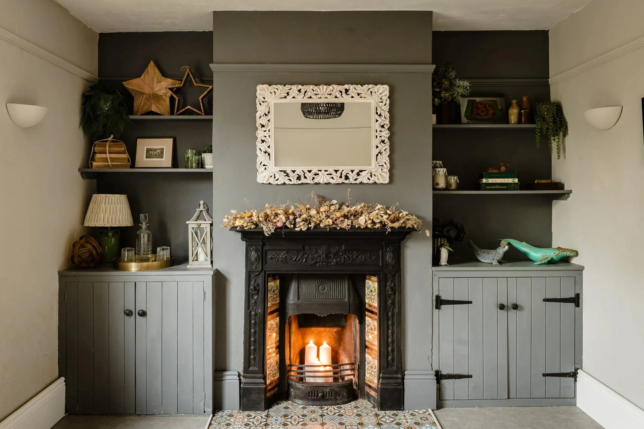Step inside via a small front garden into a charming front reception room, currently used as a dining space, complete with an original cast iron fireplace, bespoke fitted cabinetry, and a large window bringing in soft natural light.