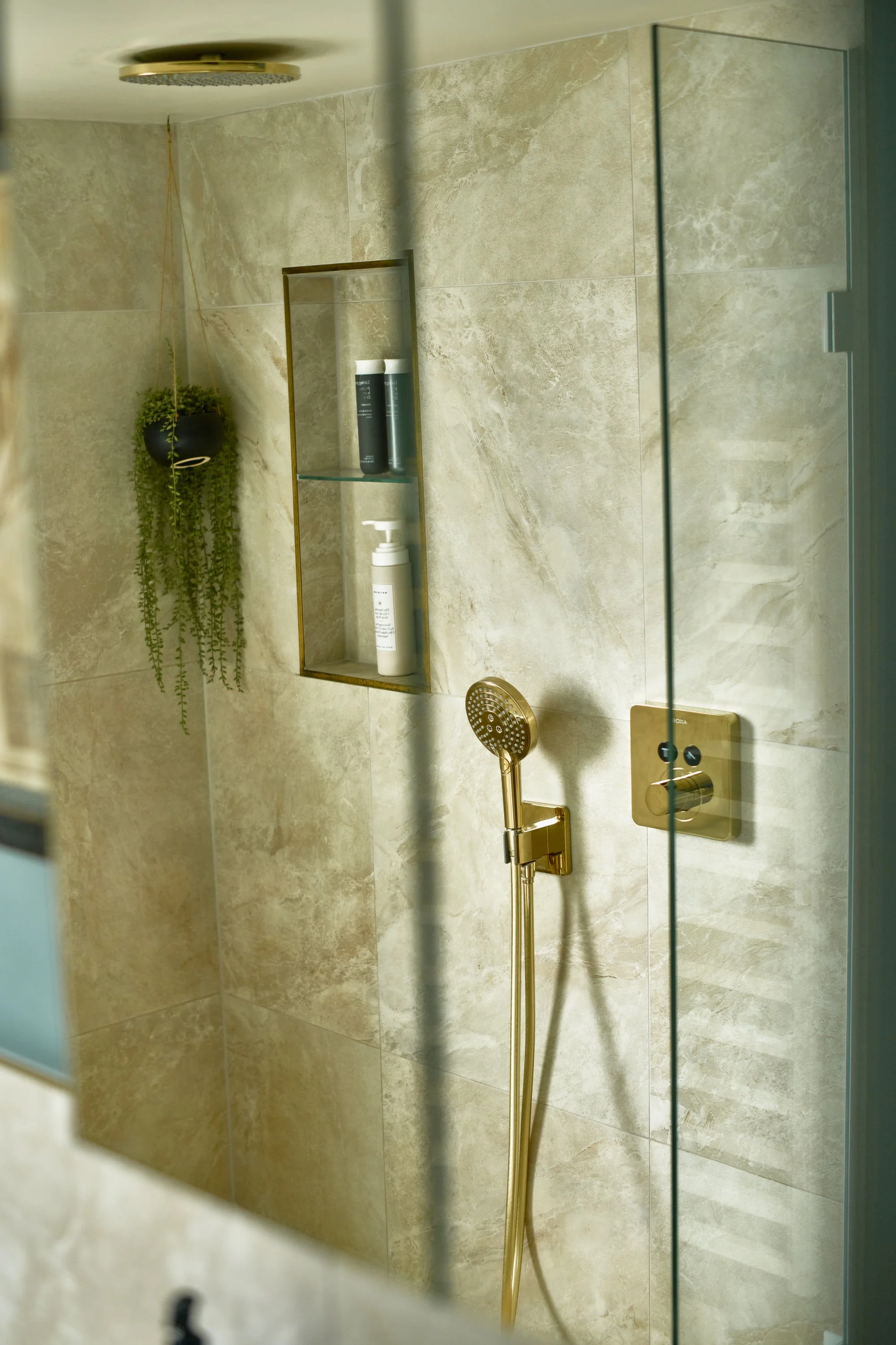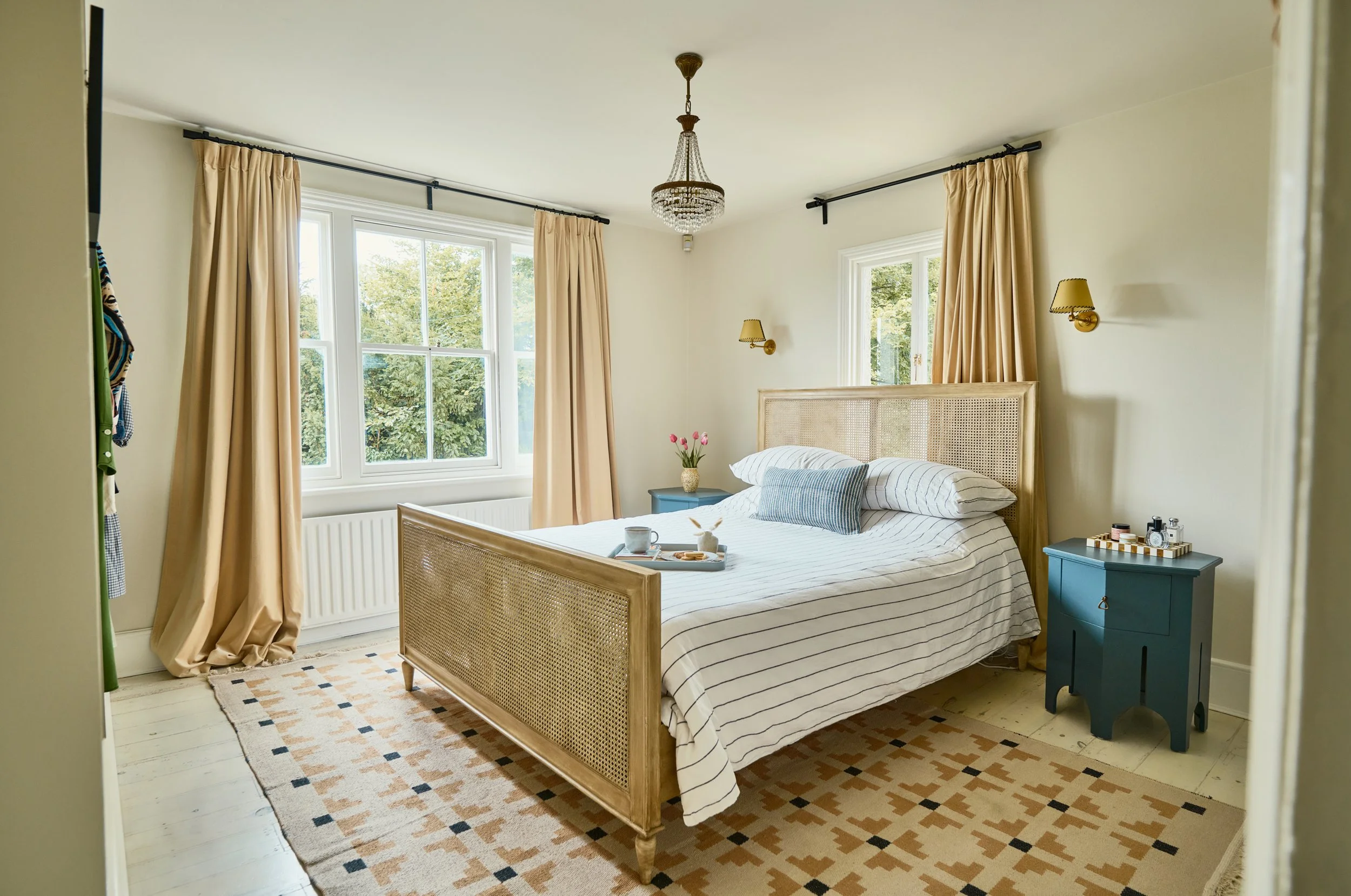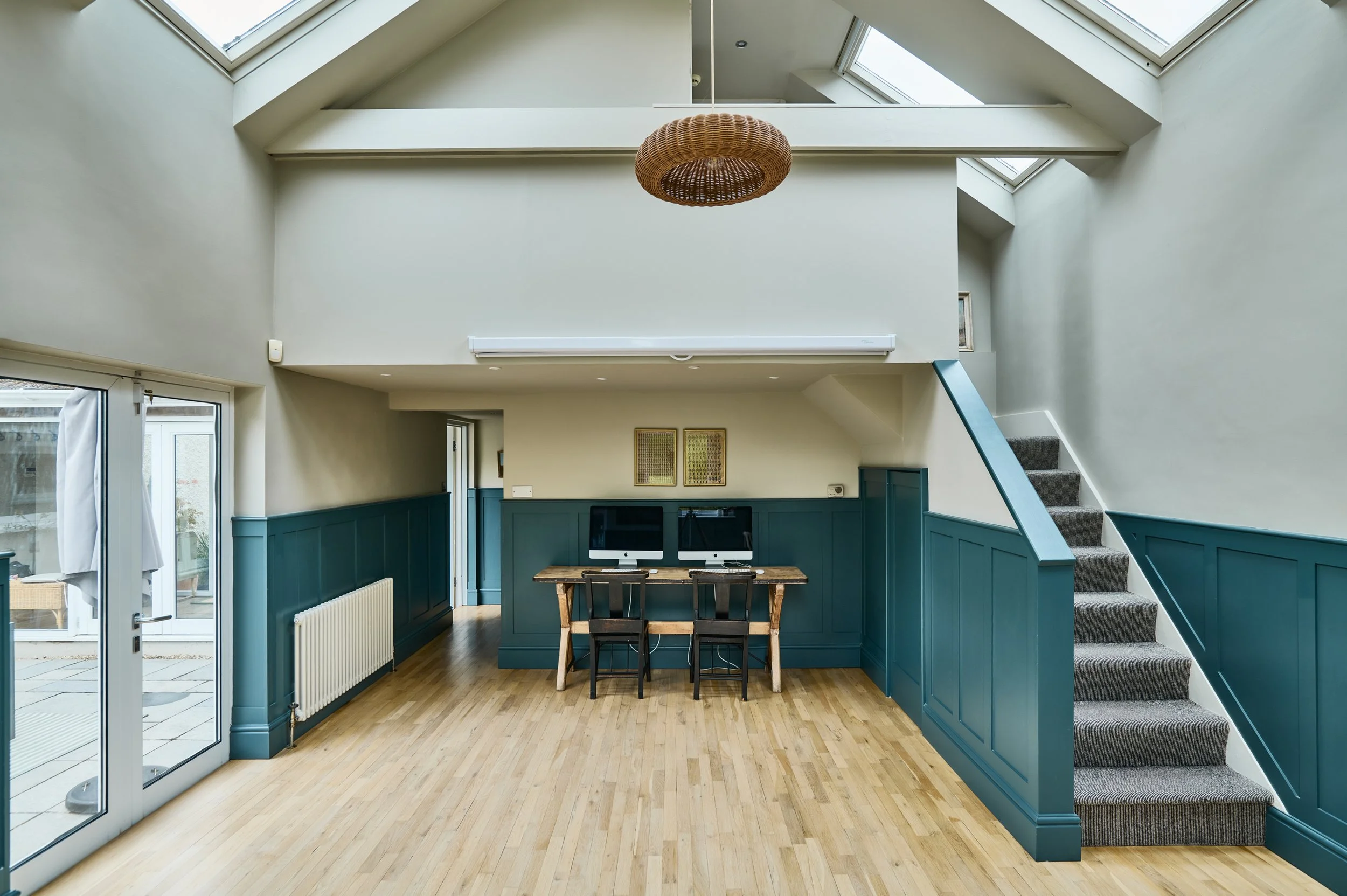 The principal suite is set on its own level, featuring a generous double bedroom with integrated storage, a smart en-suite shower room, and views over the garden. Two further double bedrooms, along with a stylish family bathroom with walk-in shower, freestanding tub, and luxurious brass fittings, are located on the other wing of the house, accessed via a separate staircase – a particularly practical and thoughtful layout.