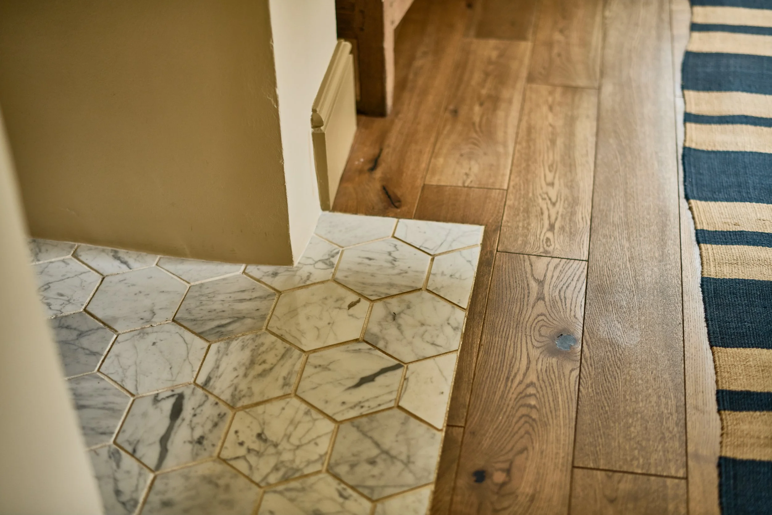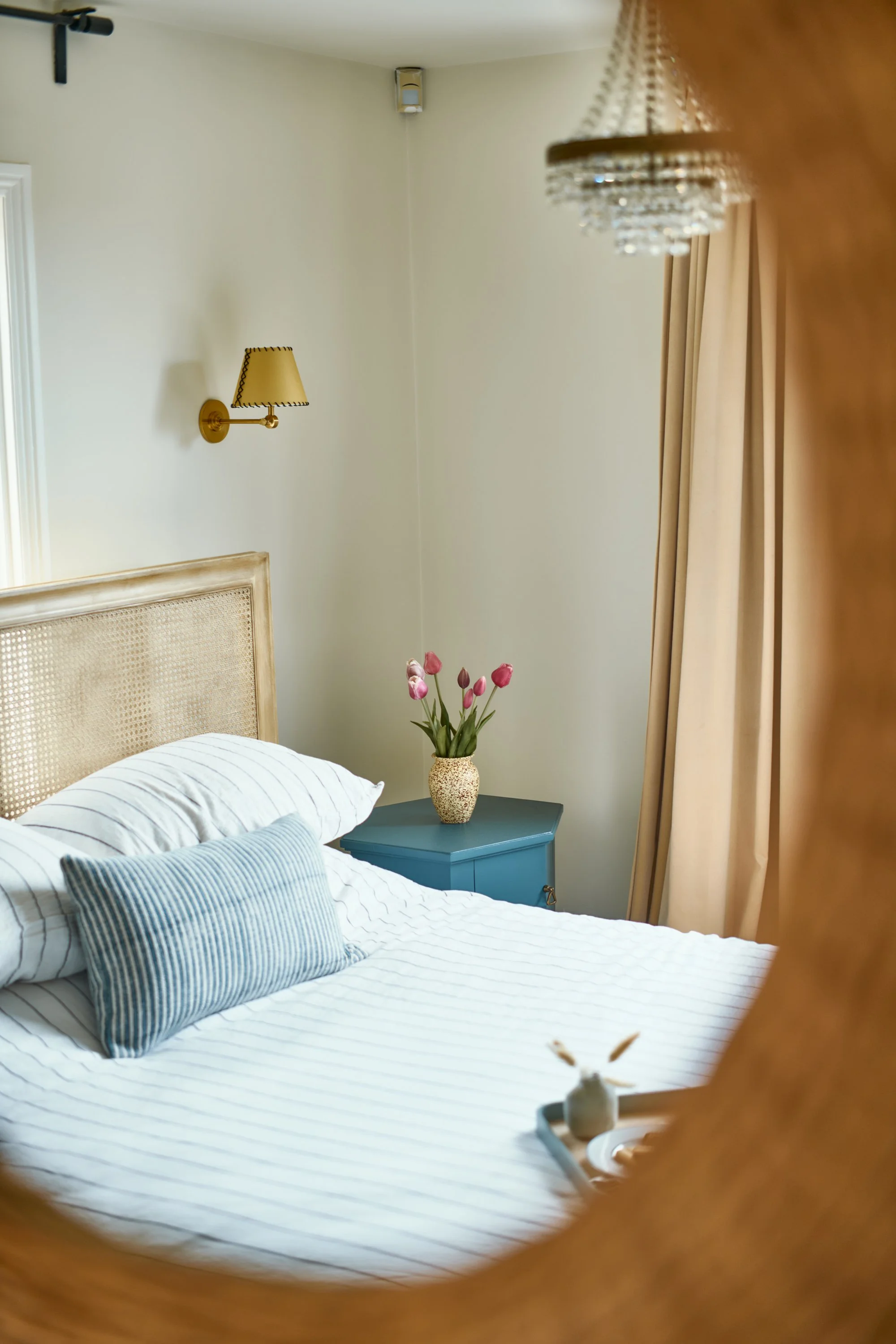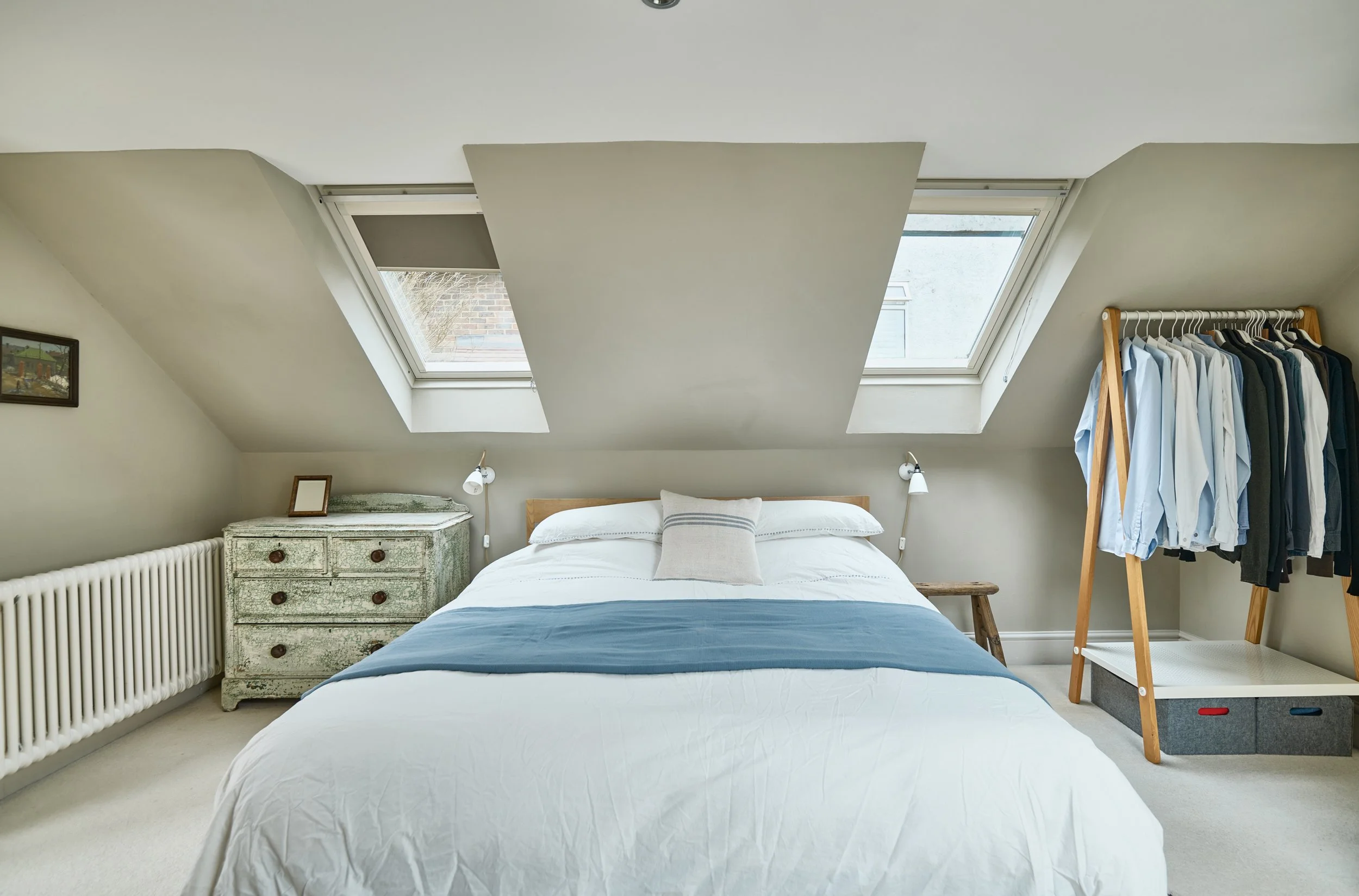 The principal suite is set on its own level, featuring a generous double bedroom with integrated storage, a smart en-suite shower room, and views over the garden. Two further double bedrooms, along with a stylish family bathroom with walk-in shower, freestanding tub, and luxurious brass fittings, are located on the other wing of the house, accessed via a separate staircase – a particularly practical and thoughtful layout.