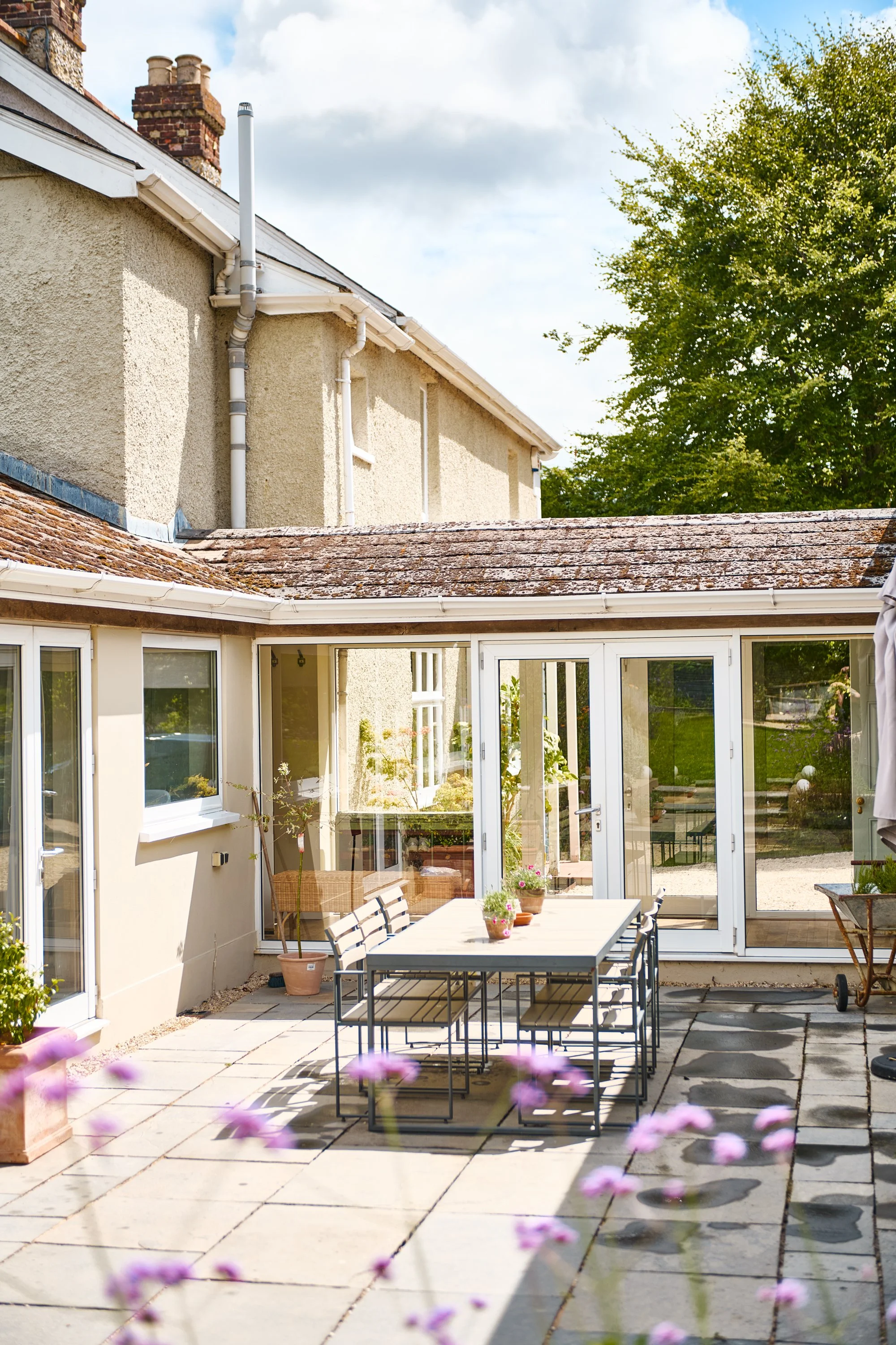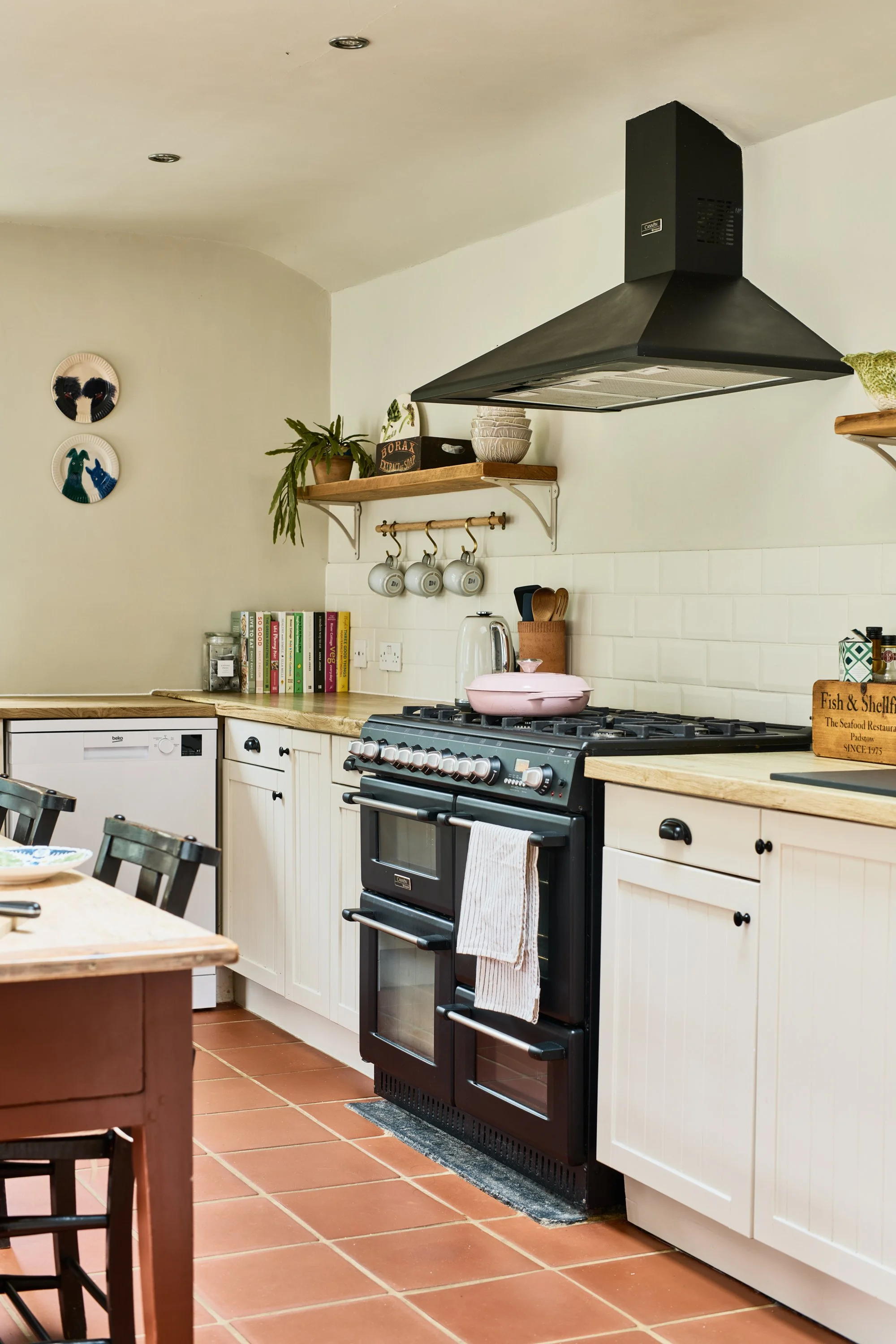 The kitchen/dining room is a true highlight. Finished in a timeless country style with shaker cabinetry, a range cooker, useful pantry and terracotta tiled flooring, it offers both function and farmhouse-style charm. Dual-aspect windows allow in plenty of light, while French doors provide a seamless connection to the rear garden – ideal for al fresco dining and summer entertaining.
