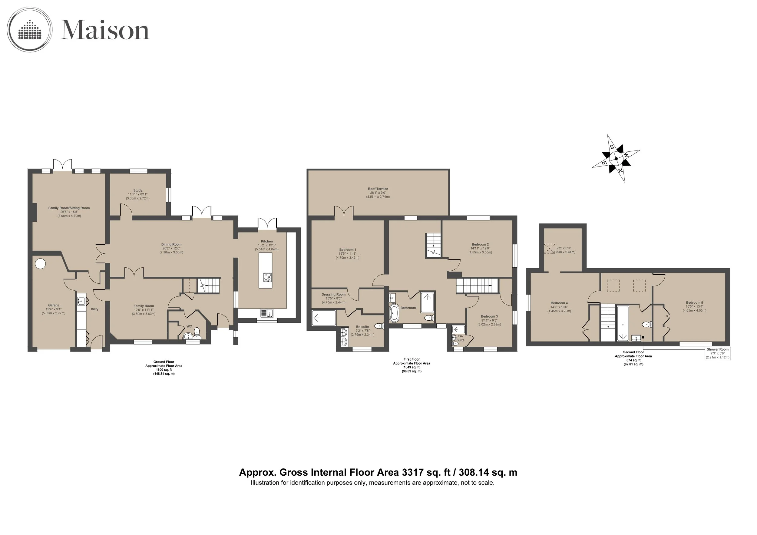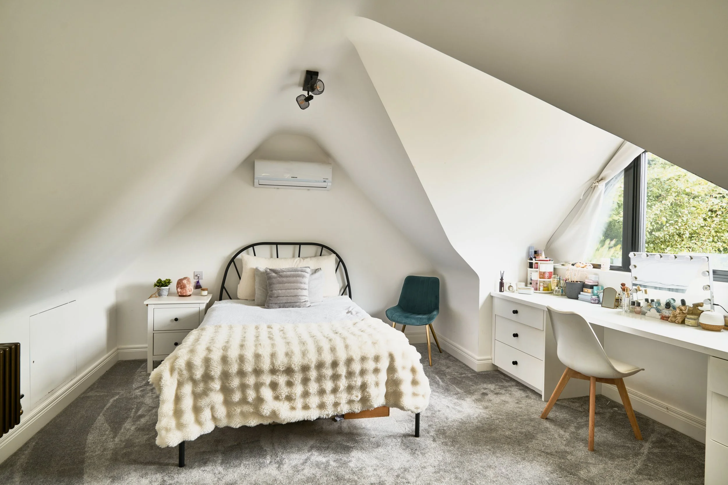Upstairs, the first floor offers three well-sized bedrooms, including a generous main suite with dressing room, en-suite shower and doors opening onto a private roof terrace. A stylish family bathroom and additional shower room serve the other bedrooms. The converted loft has added two more bedrooms with air-con and a shower room, providing excellent flexibility for larger families or home offices.
