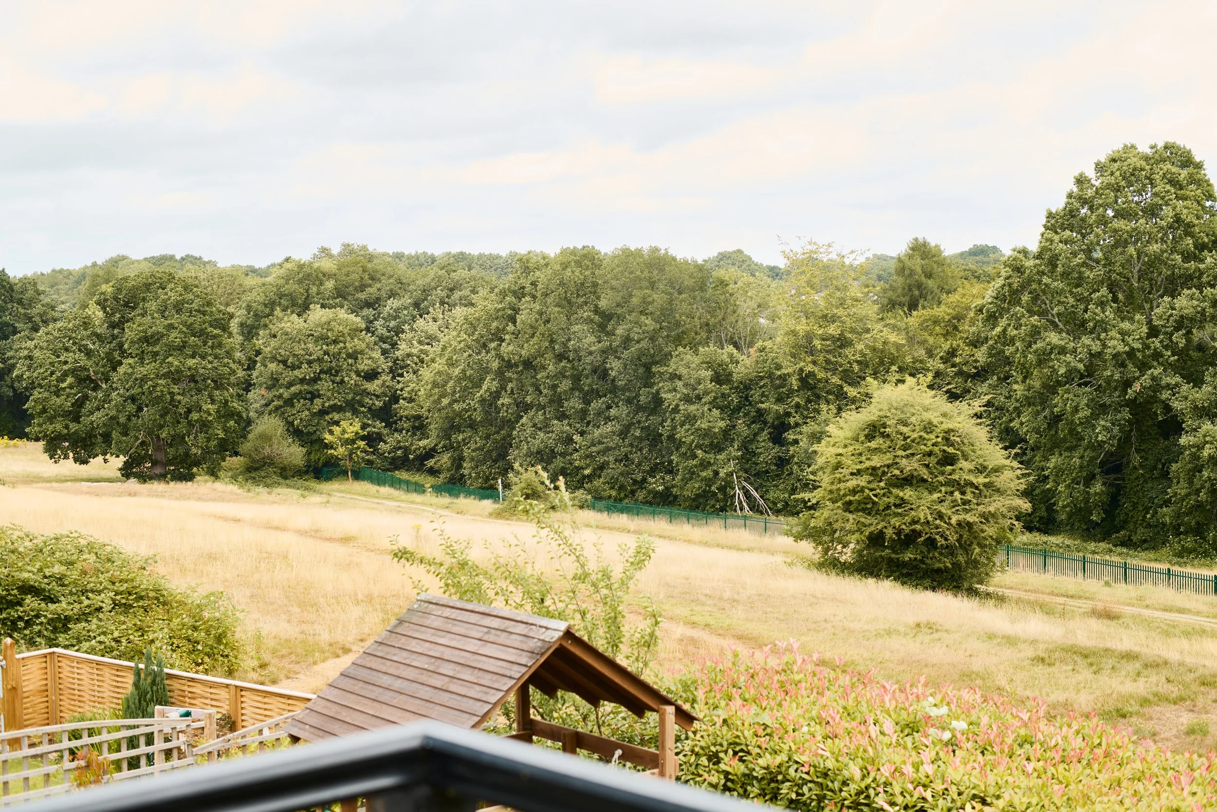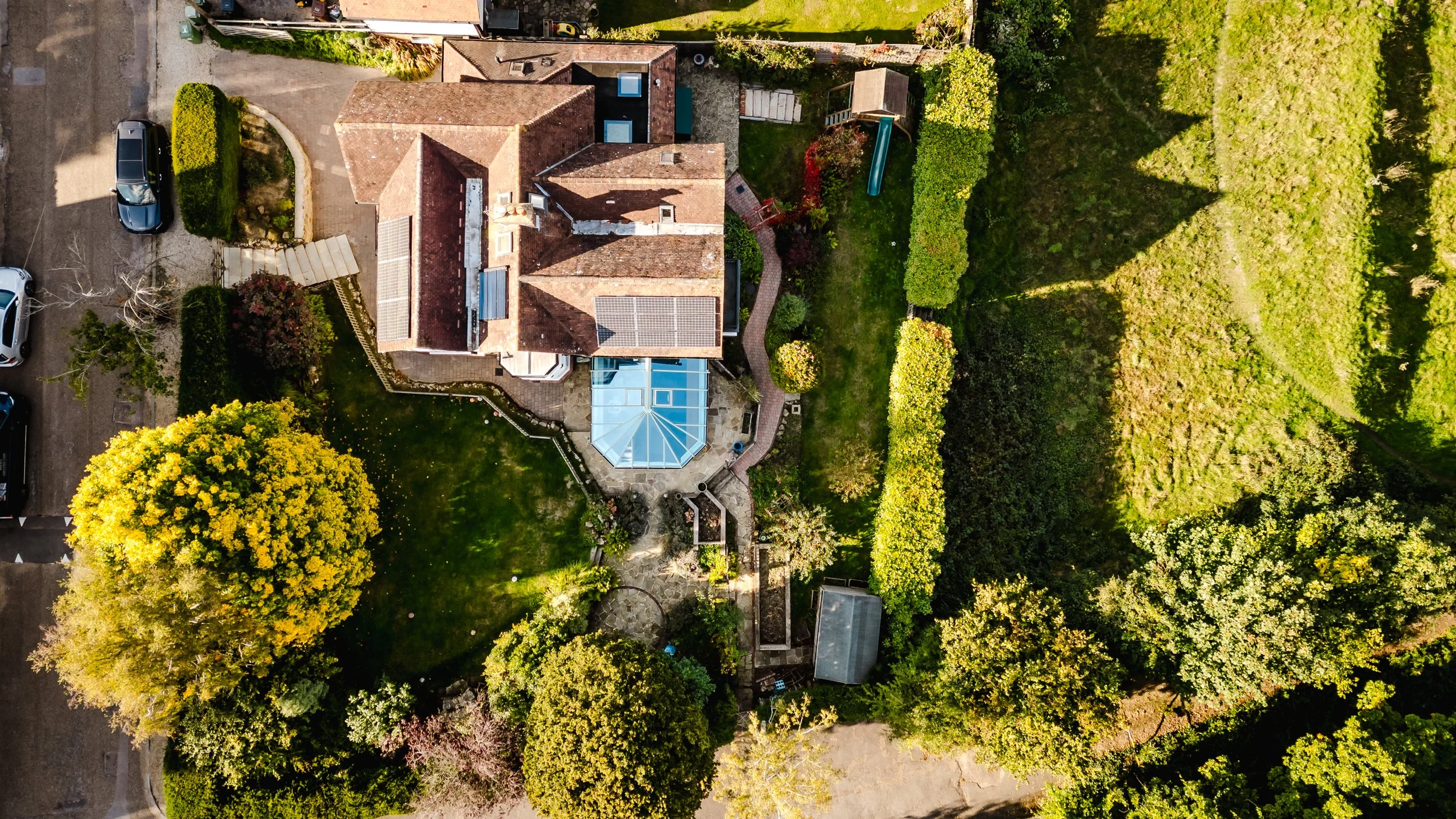Outside, the home sits within attractive wraparound gardens that feel both established and private. Mature specimen trees, lawns, and paved areas provide space to relax, while apple trees, rose beds, and a timber shed offer a touch of countryside living. The garden gate opens directly onto adjoining parkland – a dream for dog walks, children's adventures, and connecting with nature.