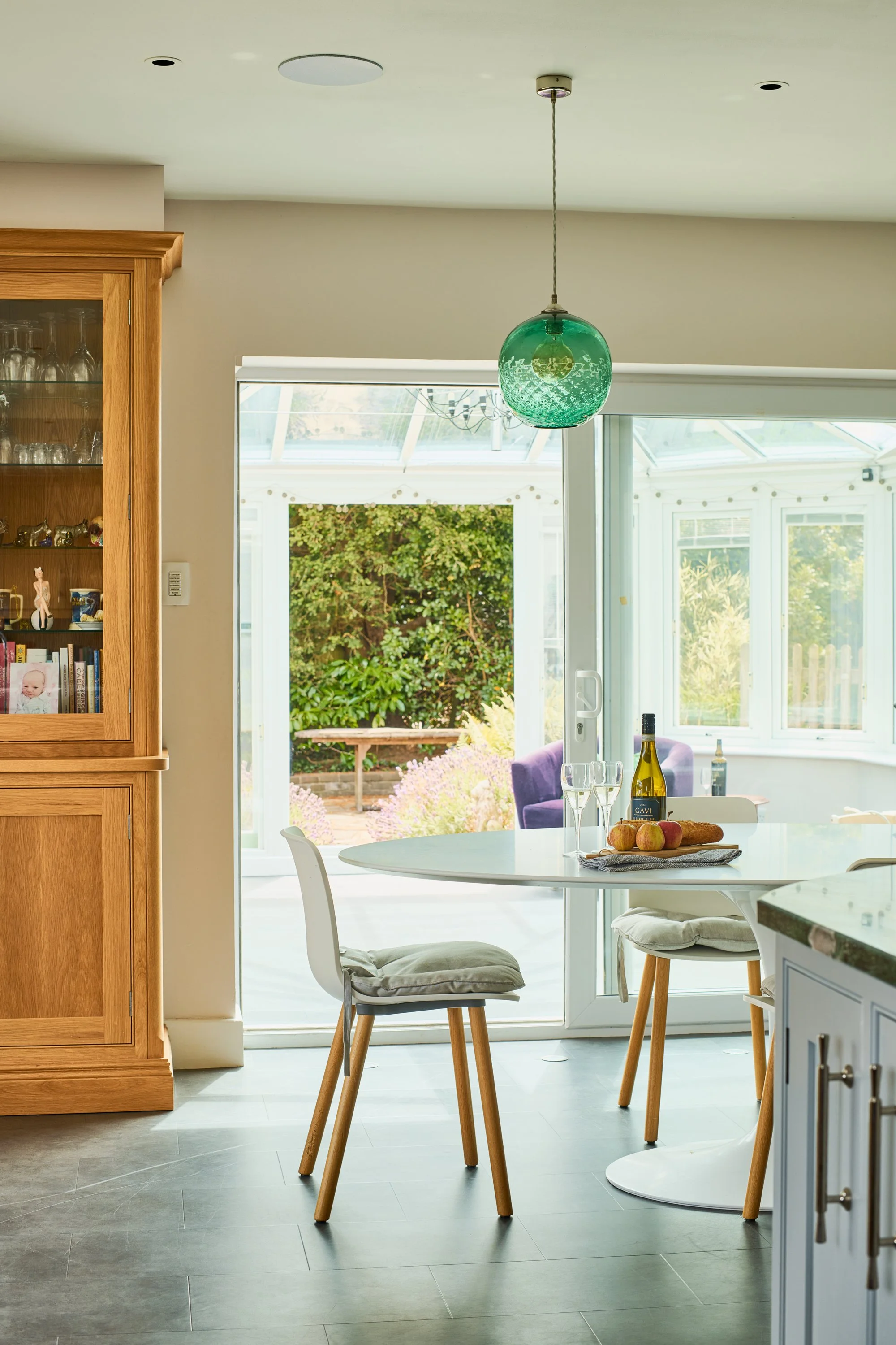 The ground floor has been thoughtfully laid out to support busy family life and enjoys underfloor heating. There’s a bright and comfortable living room with an open fireplace, perfect for cosy evenings, and a large study with fitted bookshelves – ideal for working from home or quiet reading time. The heart of the home is the impressive kitchen and dining space, where you'll find a central island, extensive bespoke cabinetry, twin ovens, a steam oven, induction hob, microwave and even a double dishwasher – everything you need for entertaining or daily family meals. A conservatory opens onto the garden, bringing in lovely natural light year-round.