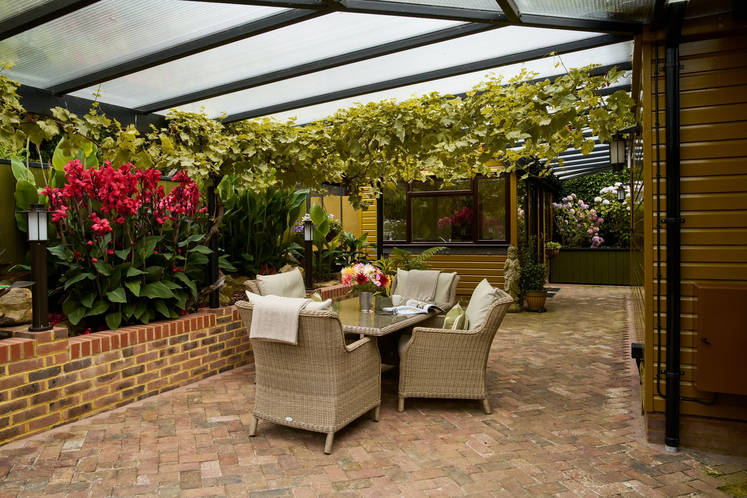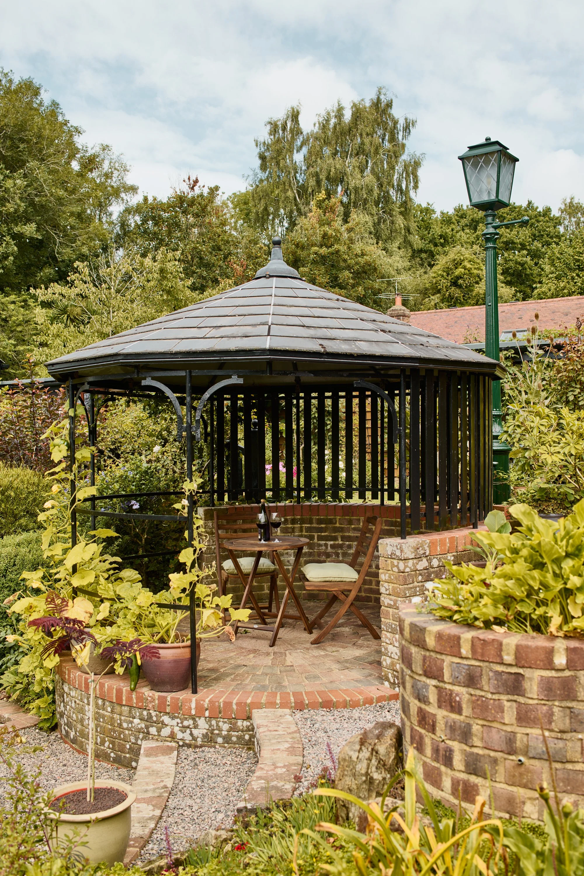 To the rear, an impressive conservatory spans the width of the property, fitted with a second wood-burner and sliding patio doors that open onto the garden—creating a lovely connection between indoor and outdoor living. A useful lobby leads out to a paved side section, complete with a gazebo for shaded seating or al fresco dining.