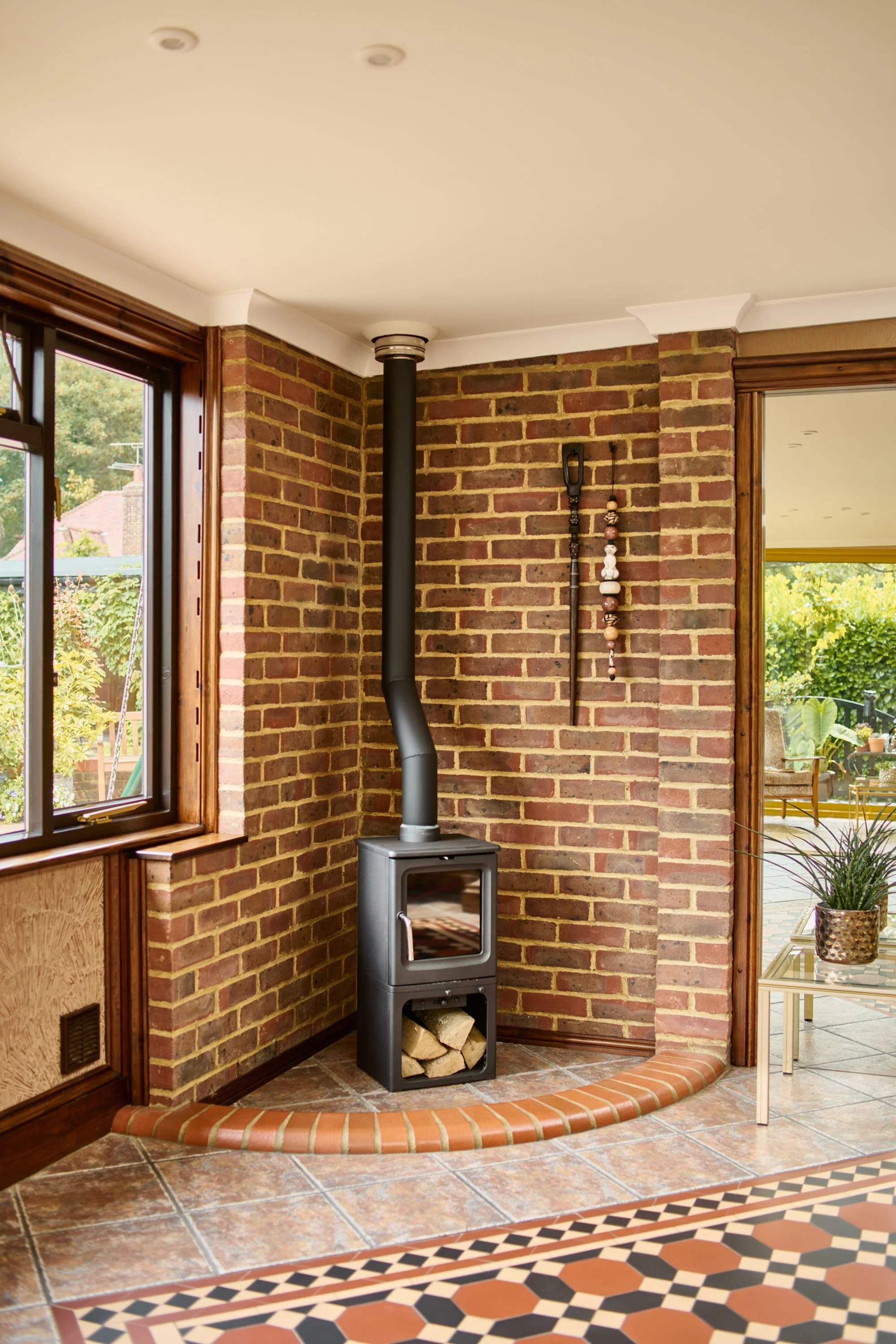 Step through the entrance porch into a welcoming hallway with a handy storage cupboard. Off the hallway are two well-proportioned ground floor bedrooms and a modern family bathroom. At the heart of the home, a generous living room features a charming wood-burning stove—perfect for cosy evenings—while the bespoke fitted kitchen is both stylish and practical, complete with high-quality units and a range-style oven.